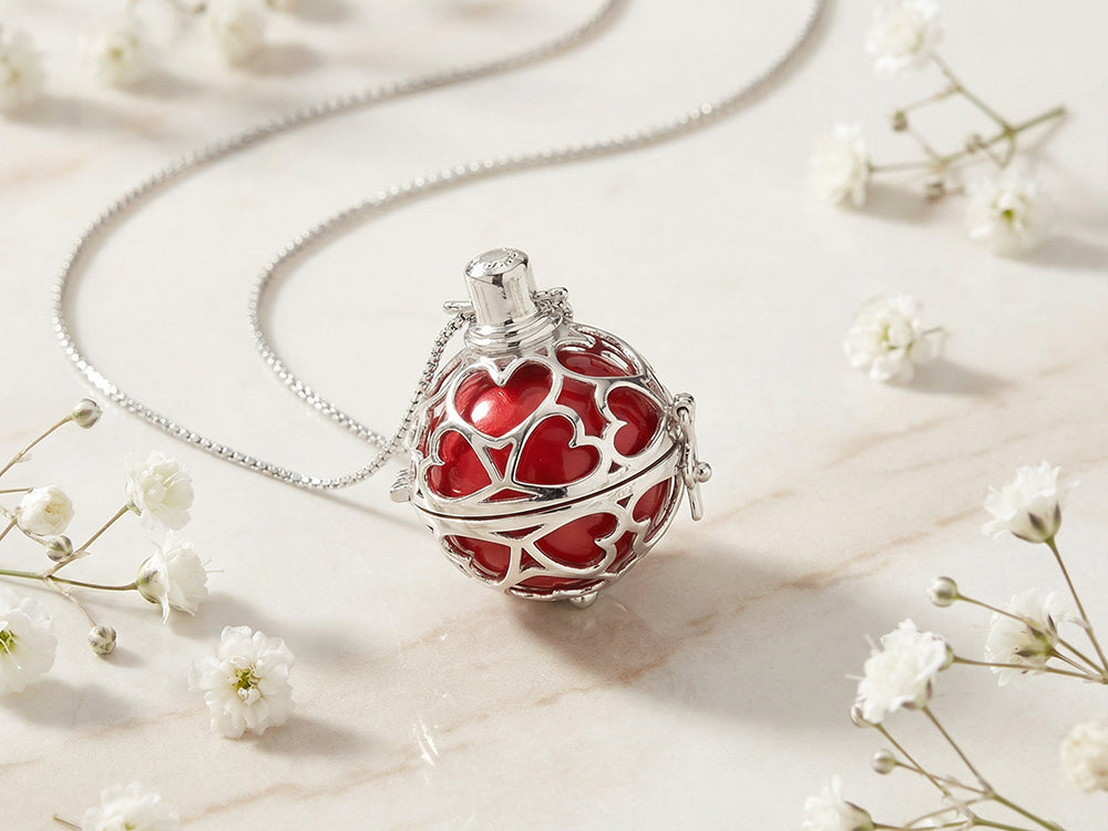 Die rote Klangkugel steht für tiefe Gefühle, Nähe und Verbundenheit. Umhüllt von schützenden Herzen wird dieser Engelsrufer zu einem liebevollen Begleiter – und zu einem besonderen Zeichen für echte Herzensmomente.