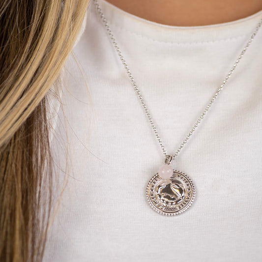 Halskette 925er Silber Krebs mit Kraftstein Rosenquarz und Zirkonia