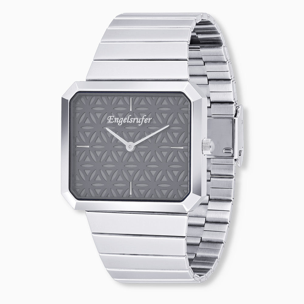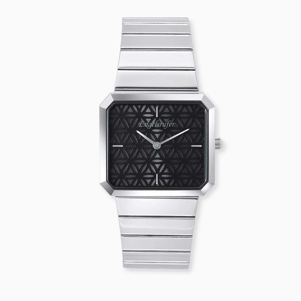 Das Band ist dabei individuell verstellbar und kann auf maximal 21,5 cm Umfang eingestellt werden. Die Kombination aus Silber und Schwarz ist sanft und zart, gibt Hoffnung und beruhigt in schwierigen Zeiten. Das fein ausgearbeitete Lebensblume Motiv schenkt Dir unendliche Kraft und fördert die Harmonie und Lebensfreude. Unsere Empfehlung: Durch das Schnellverschluss-System können alle Bänder unserer Engelsrufer Uhren einfach mittels Fingerdruck vom Gehäuse entfernt und ausgetauscht werden. Außerdem lassen sich alle Engelsrufer Uhren auf der Gehäuserückseite individuell gravieren. Durch eine Gravur wird sie zu Deinem persönlichen Unikat.