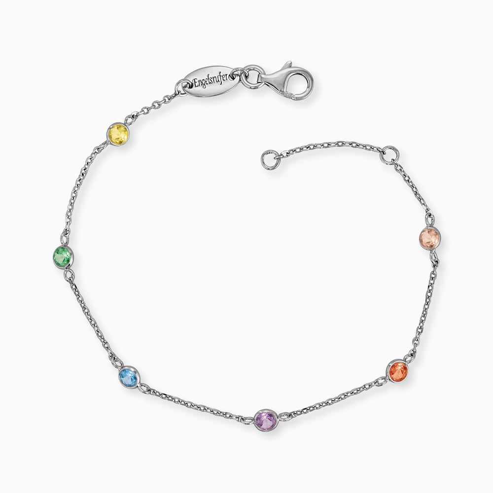 Keep it so simple: Pure Eleganz, wunderschöne Weiblichkeit und strahlende Jugend - alles in Einem verleiht dieses wunderschöne filigrane Armband Little Moon. Ein besonderes Highlight sind die edel schimmernden synthetischen Zirkonia Steine in Multicolor. Das farbenfrohe Wunder strahlt wie ein Regenbogen umgeben von klassischem Silber. Kombiniert mit mehreren Armbändern oder einer Uhr entsteht ein toller Layering-Effekt, der als Duo, Trio oder Quartett eine wunderschöne Symphonie ergibt. Das zeitlose Schmuckstück wird mit einem Karabinerhaken verschlossen und ist in zwei Längen verstellbar.