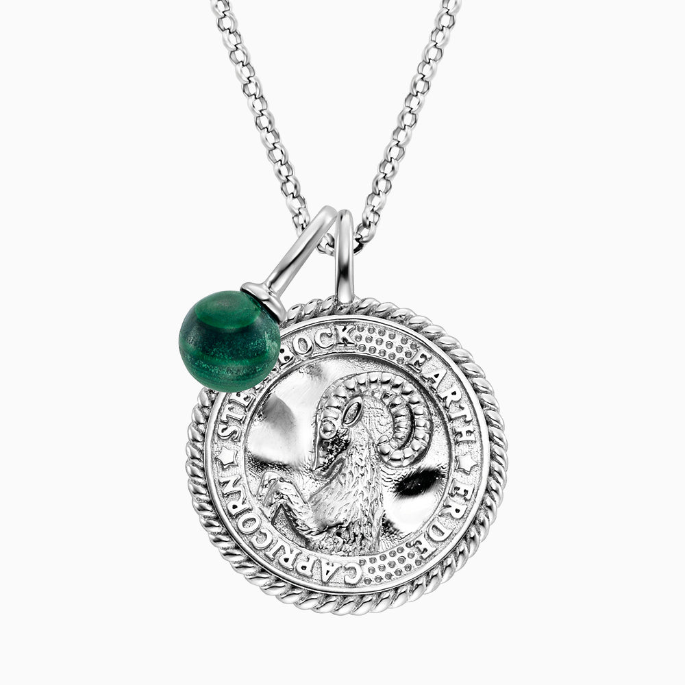Die Schönheit der Natur kombiniert mit Deinem persönlichen Sternzeichen Steinbock vom 22.12. bis 20.1. des Jahres. Unsere wunderschöne Kette zeigt Dir das bedeutungsvolle Symbolbild des Tierkreises und Deiner Kraftperle aus dem Naturstein Malachit. Als Gravurtext findest Du den Namen Steinbock sowie das Element Erde auf der Vorderseite der Münze und das Sternenbild auf der Rückseite. Der Malachit als persönlicher Kraftstein stärkt das Selbstvertrauen des Steinbocks und schenkt ihm eine positive Sichtweise. Das zeitlose Schmuckstück wird mit einem Karabinerhaken verschlossen und ist in drei Längen verstellbar.