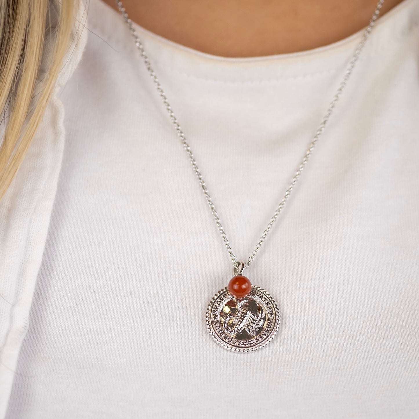 Die Schönheit der Natur kombiniert mit Deinem persönlichen Sternzeichen Skorpion vom 24.10. bis 22.11. des Jahres. Unsere wunderschöne Kette zeigt Dir das bedeutungsvolle Symbolbild des Tierkreises und Deiner Kraftperle aus dem Naturstein Roter Jaspis. Als Gravurtext findest Du den Namen Skorpion sowie das Element Wasser auf der Vorderseite der Münze und das Sternenbild auf der Rückseite. Der Rote Jaspis als persönlicher Kraftstein verleiht dem Skorpion Zuversicht und die Fähigkeit, Erfahrungen geistig zu verarbeiten. Das zeitlose Schmuckstück wird mit einem Karabinerhaken verschlossen und ist in drei Längen verstellbar.