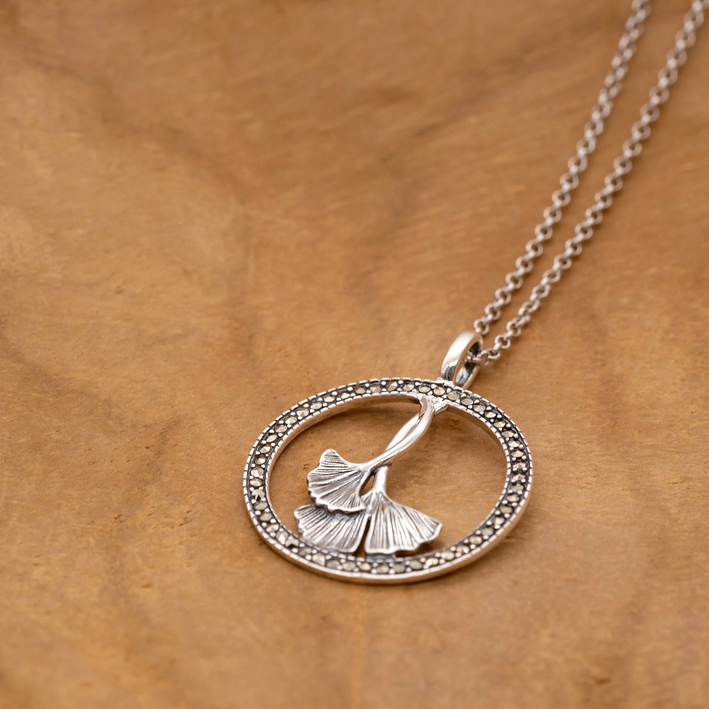 Ginkgo Love - diese filigrane Ginkgo Kette überzeugt durch die Vielzahl an kleinen Details. Der moderne Look mit schwarzen Markasit Steinen unterstreicht die Vielfältigkeit des Ginkgos. Das Besondere an dem Ginkgo sind seine unverwechselbaren zweigeteilten Blätter, welche an eine fächerige Form erinnern und symbolisch für die Liebe zweier Menschen stehen. Das zeitlose Schmuckstück wird mit einem Karabinerhaken verschlossen und ist in drei Längen verstellbar.