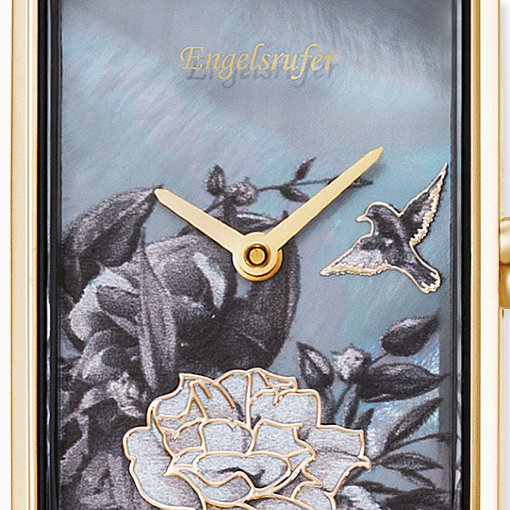 Das Band ist dabei individuell verstellbar und kann mindestens auf 16 cm und maximal 21 cm Umfang eingestellt werden. Die feinen Akzente des Zifferblattes mit zartglänzenden Perlmutt Details, überzeugen im märchenhaften Design aus romantischen Blüten und einem Colibri. Unsere Empfehlung: Durch das Schnellverschluss-System können alle Bänder unserer Engelsrufer Uhren einfach mittels Fingerdruck vom Gehäuse entfernt und ausgetauscht werden. Im Handumdrehen kann passend zur Tagesstimmung oder zu jedem Deiner Outfits, das passende Engelsrufer Uhrenband kombiniert werden. Außerdem lassen sich alle Engelsrufer Uhren auf der Gehäuserückseite individuell gravieren. Durch eine Gravur wird sie zu Deinem persönlichen Unikat.