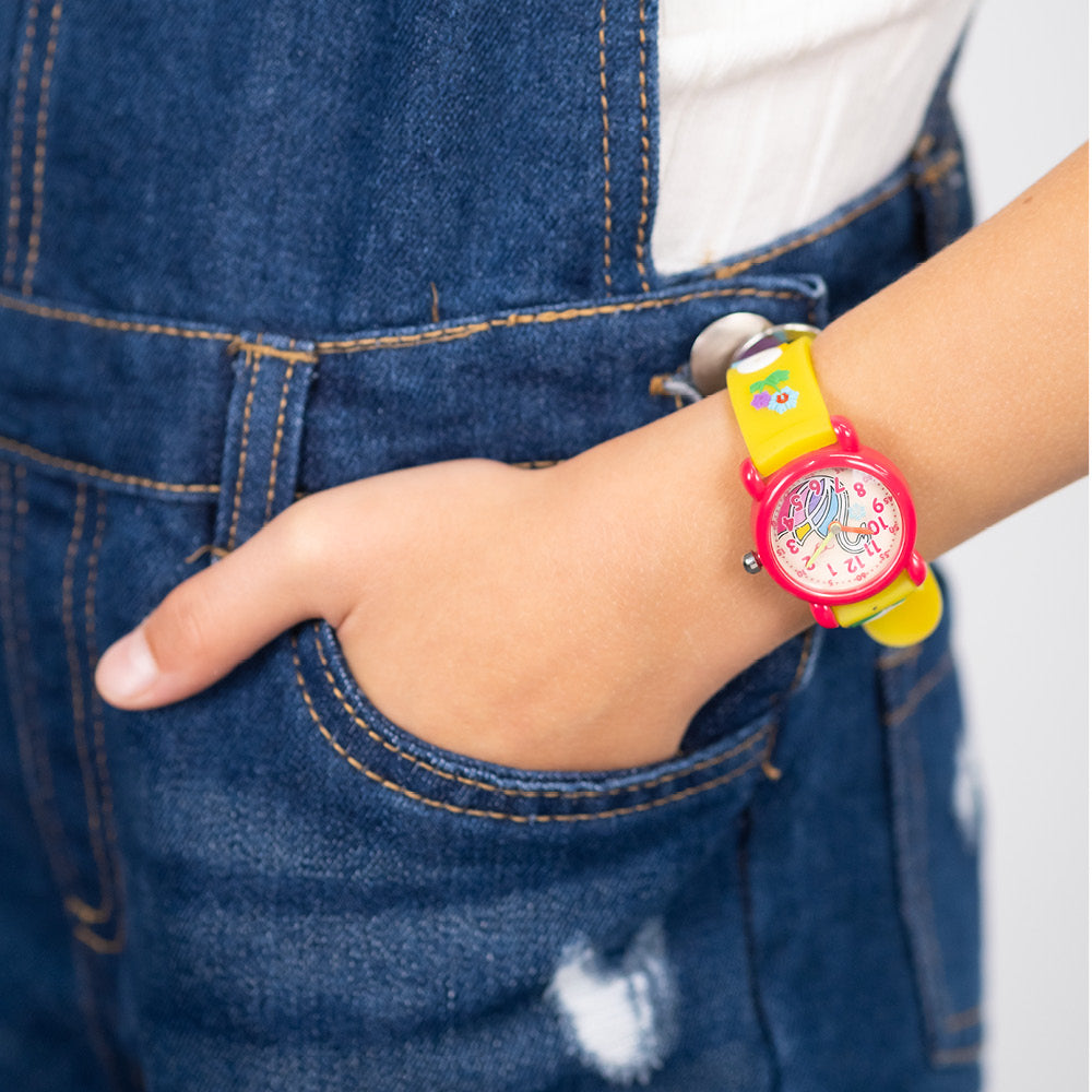 Das gut lesbare Zifferblatt mit Stundenzahlen, Minutenstrichen sowie deutlich sichtbaren Stunden- und Minutenzeigern erleichtert Kindern das Ablesen der Zeit. Besonders hervorzuheben ist der Sekundenzeiger mit einem niedlichen, sich im Sekundentakt bewegenden Motiv.
