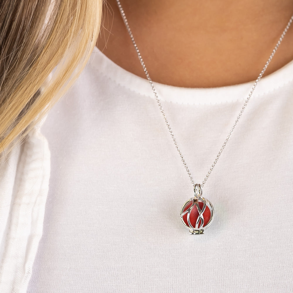 Deine persönliche Kraftperle in einem filigranen Anhänger aus unserer Powerful Stone Kollektion. Unsere wunderschöne Engelsrufer Kette mit einem bezaubernden Schmuckgehäuse als Anhänger, präsentiert Dir hier einen Roten Jaspis als "Stein der Vitalität und Kraft". Die Kraftperle kann nach individuellem Befinden und Belieben ausgetauscht werden. Das silberne Körbchen umschließt die Kraftperle schützend und besticht durch das wunderschöne Muster des Paradise. Kraftperlen brauchen die richtige Pflege, um eine lange Lebensdauer der Steine zu garantieren. Deswegen bekommst Du mit jedem Produkt aus unserer Powerful Stone Kollektion eine kleine Guideline, mit den wichtigsten Schritten zum Entladen, Reinigen und Aufladen. Das zeitlose Schmuckstück wird mit einem Karabinerhaken verschlossen und ist in drei Längen verstellbar.