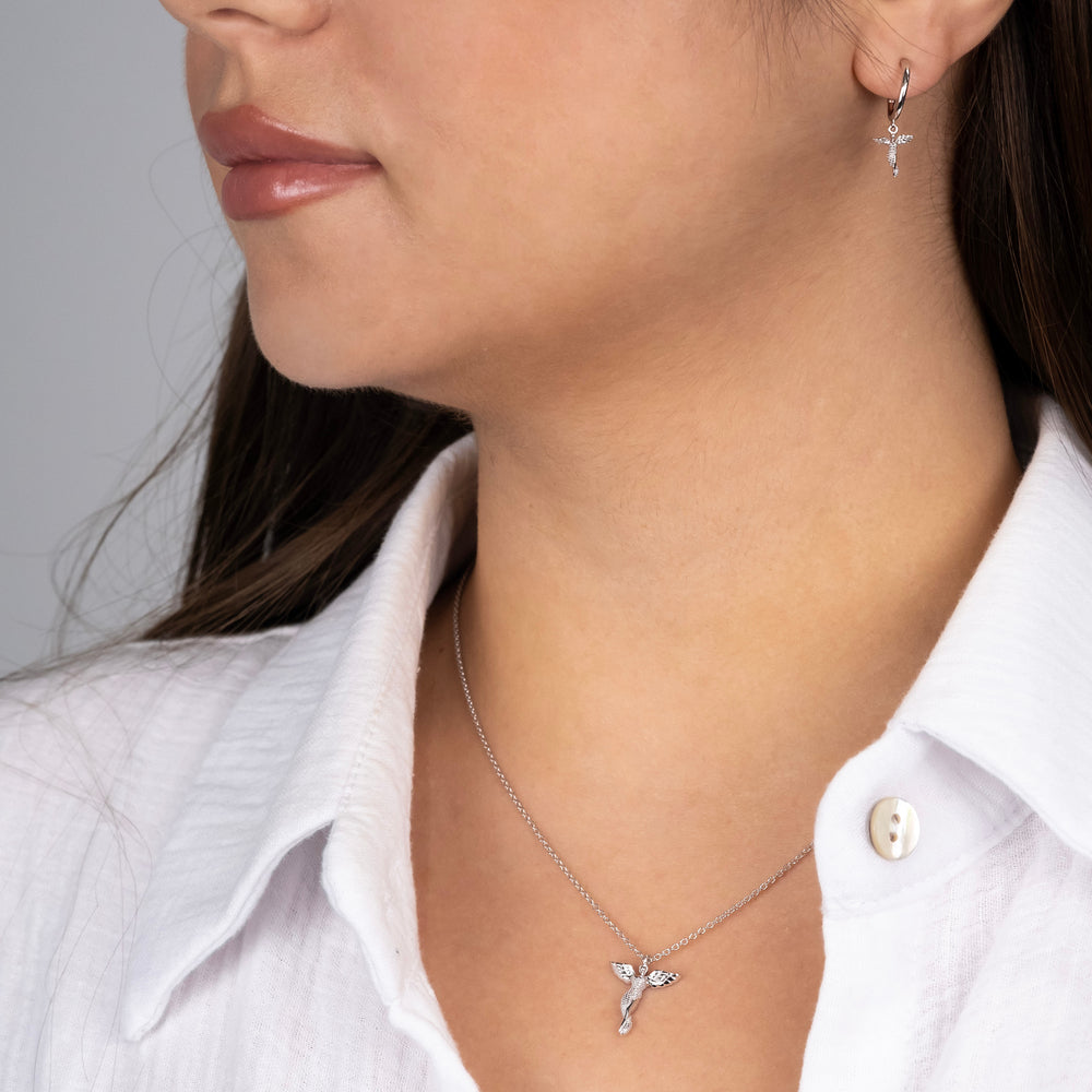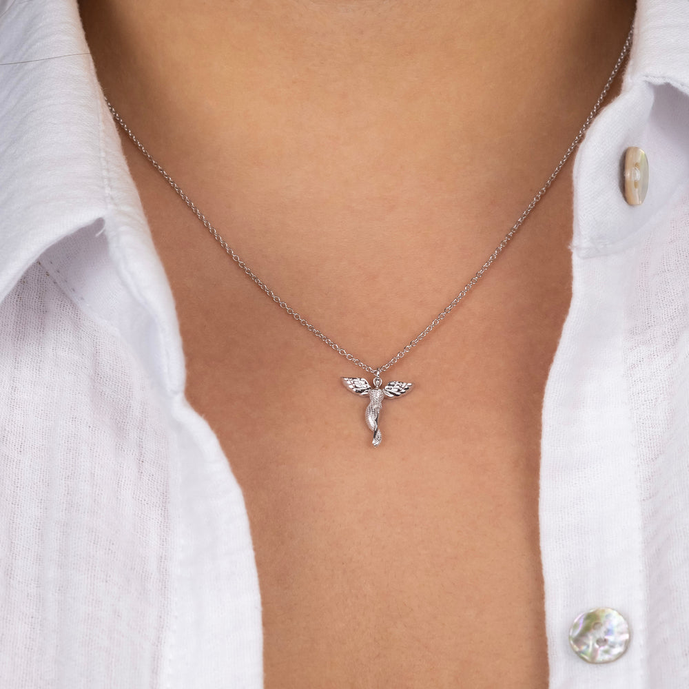 Dein Schutzengel für die Ewigkeit - diese filigrane Kette mit unserem Engel Anhänger schenkt Dir Glück und passt dabei wunderbar zu jedem Outfit. Engel sind himmlische Beschützer in jeder Lebenslage, sie geben Dir das Gefühl von Sicherheit und unendlicher Geborgenheit. Dein Engel breitet seine schützenden Flügel über Dich und steht Dir immer zur Seite. Ein besonderes Highlight sind die edel schimmernden synthetischen Zirkonia Steine. Denn was könnte femininer sein als strahlend schöne Kristalle umgeben von klassischem Silber.