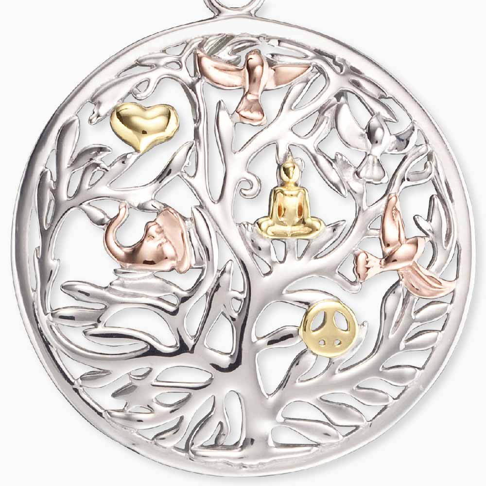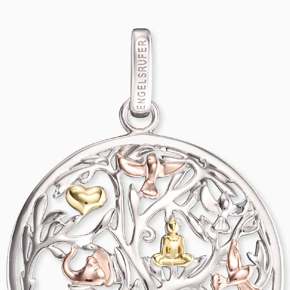 Dieser traumhafte Engelsrufer Anhänger in Tricolor verzaubert Dich durch die Vielzahl seiner kleinen liebevollen Details. Der fein ausgearbeitete Lebensbaum mit seinen Motiven wie Herz, Buddha, Elefant und Taube schenken Dir unendliche Harmonie, Stärke und Lebensfreude. Das ausdrucksstarke Tricolor besticht in zart schimmernden Pastelltönen und wirkt besonders sanft. Kombiniert mit mehreren Anhängern und Ketten entsteht ein toller Layering-Effekt, der als Duo, Trio oder Quartett eine wunderschöne Symphonie ergibt.