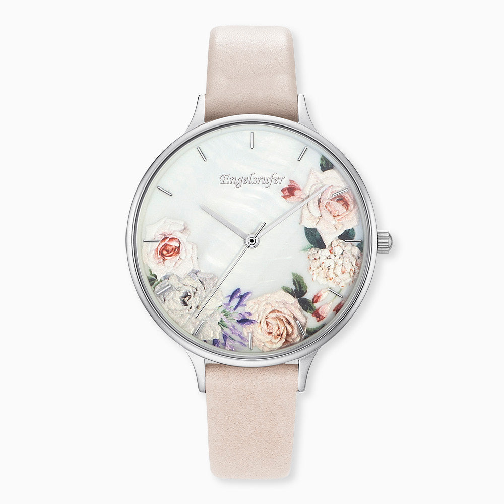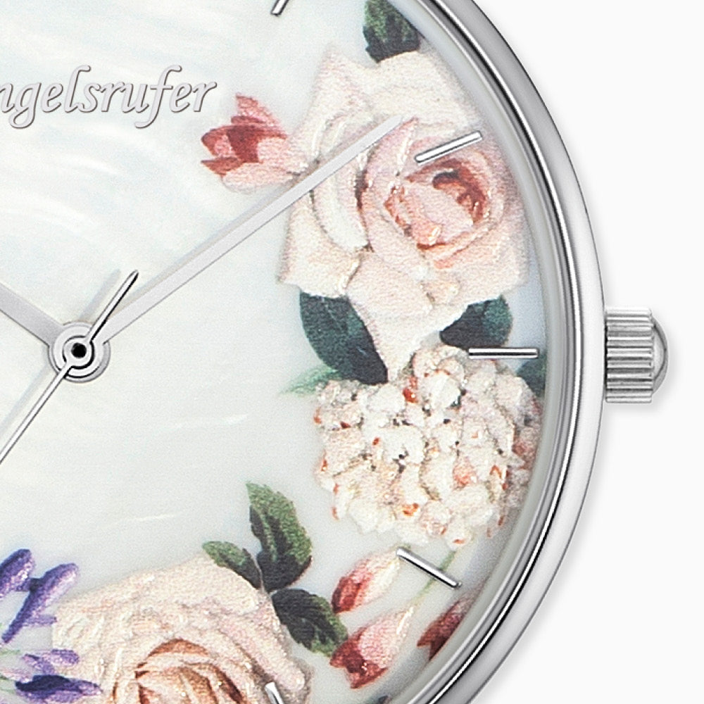 Romantic Flowers – diese zeitlose Kombination verzaubert mit einem runden Gehäuse, 3-Zeiger-Werk sowie einem Uhrenband aus hochwertigem echtem italienischem Leder. Das Band ist dabei individuell verstellbar und kann mindestens auf 16 cm und maximal 21 cm Umfang eingestellt werden. Der feine Akzent des Zifferblattes in zartglänzendem Perlmutt mit romantischer Blumenmalerei macht diese Uhr zu einem stilvollen Evergreen.