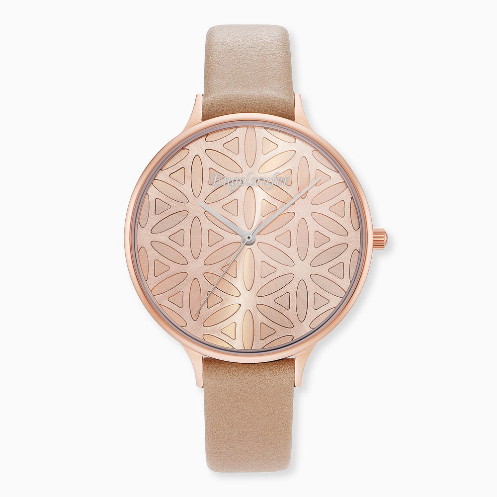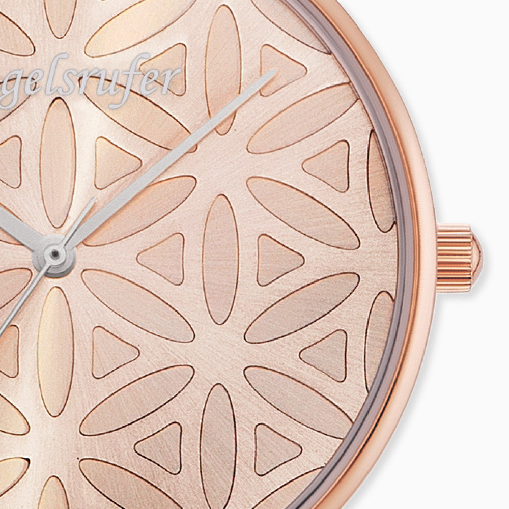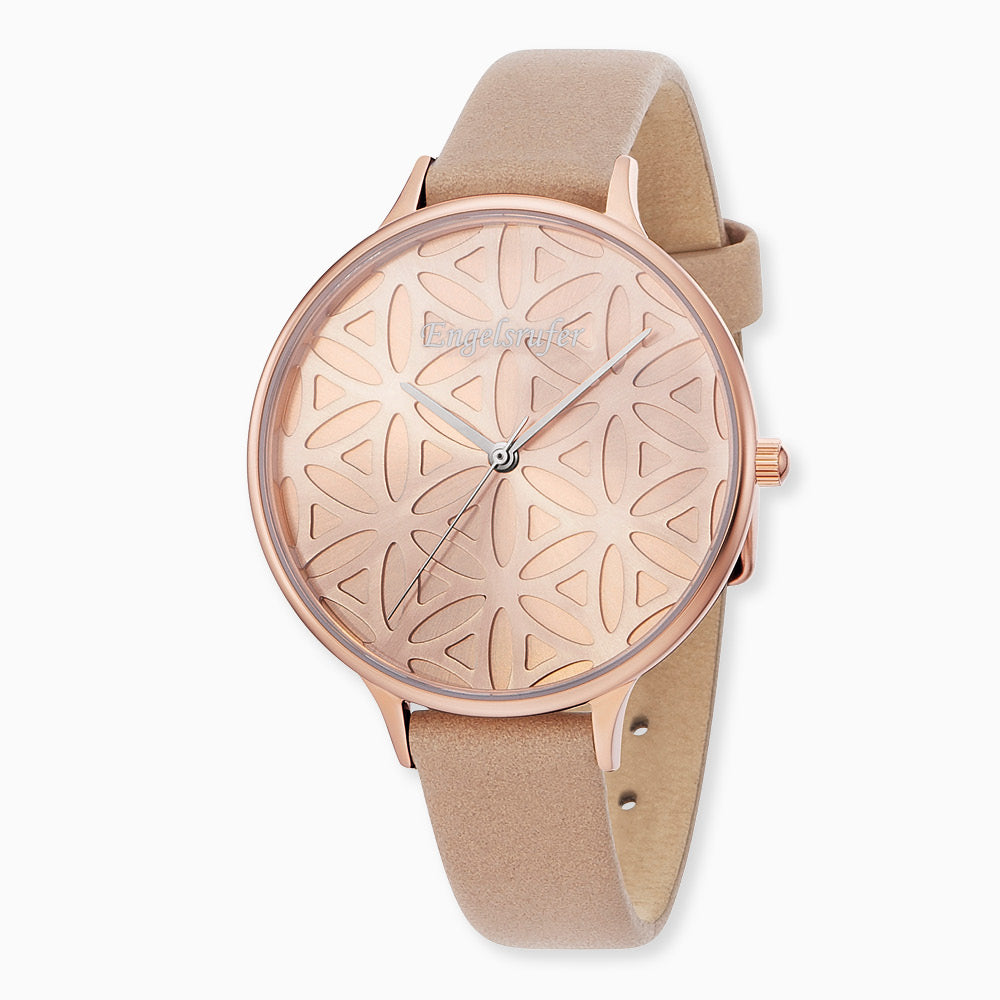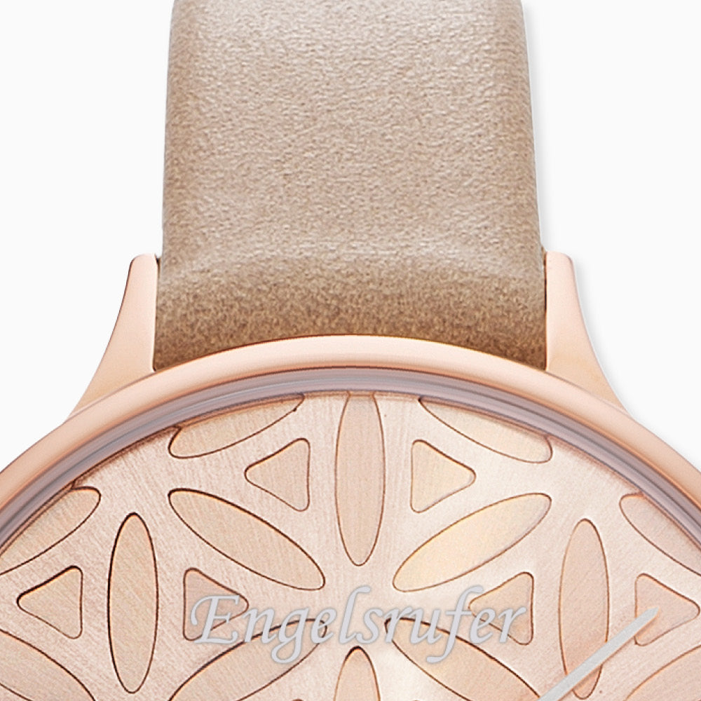 Uhr Edelstahl Lebensblume Rosegold mit Nubuk Lederband Hellbraun